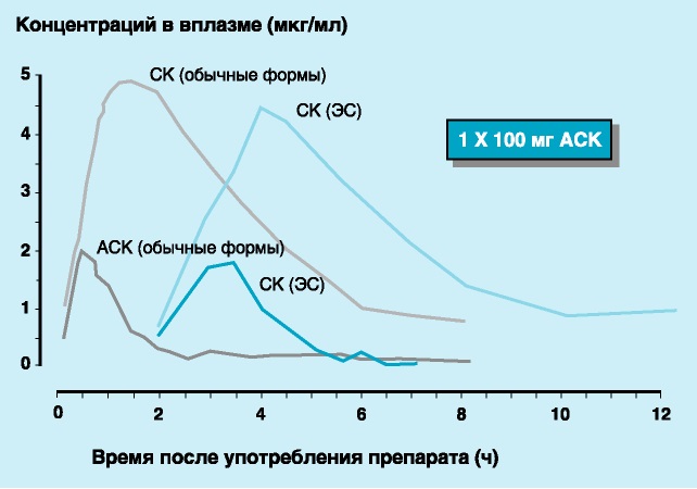 После употребления разовой дозы, состоящей из одной или трёх таблеток Аспирина (ЭС), (что соответствует 100 и 300 мг АСК) максимальные концентрации АСК в плазме крови достигаются через 3.5 и 4 ч., соответственно (таб. 1). Вследствие ферментной эстеразной активности, концентрация АСК в плазме снова быстро падает, тогда как концентрация основного метаболита – салициловой кислоты – повышается и достигает максимума через 4 и 5,5 ч. после приёма препарата соответственно (рис. 7; табл. 1).