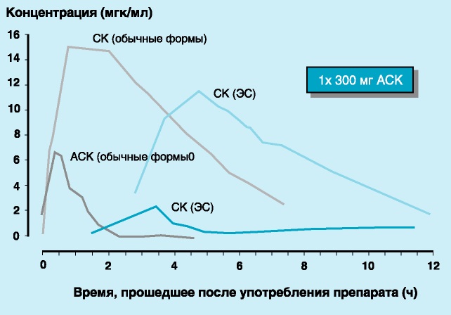 Чтобы избежать раздражения слизистой оболочки желудка под действием ацетилсалициловой кислоты и, таким образом, улучшить её переносимость (в частности, при долговременном употреблении с целью профилактики тромбоза), таблетки Аспирина покрыты оболочкой, растворяющейся в кишечнике. Таким образом, активный ингредиент (ацетилсалициловая кислота) высвобождается не в желудке, а только в тонком кишечнике. Поэтому при употреблении таблеток Аспирина в такой оболочке абсорбция АСК задерживается примерно на 2 ч. по сравнению с обычными таблетками (рис. 7).