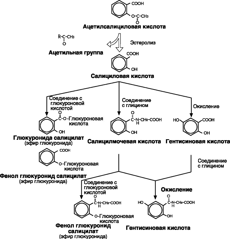 После приема АСК в дозе 1.5 г салициловая кислота оказывается связанной с глицином (до 75%), образуя салицилмочевую кислоту. Этот процесс ограничен. После достижения уровня насыщения от 1 до 2 мкг/мл концентрация салициловой кислоты в плазме далее не повышается, несмотря на дальнейшее повышение содержания салицилата (Levy и соавт., 1969).
