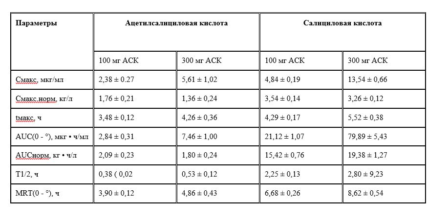 Таблица 1. Фармакокинетические параметры ацетилсалициловой и салициловой кислоты после приема 1 таблетки Аспирина (ЭС) 100 или 300 мг (что соответствует 100 мг и 300 мг ацетилсалициловой кислоты) (M±m).