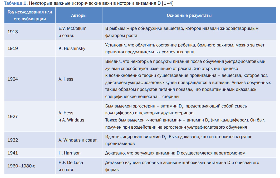 История изучения витамина-гормона D насчитывает не одно столетие. Некоторые важные вехи данного пути суммированы в табл. 1. Первое косвенное упоминание о действии этого вещества отмечено еще в 1650 г. Английский врач F. Glisson описал болезнь (он назвал ее рахитом), выявленную у детей, проживавших в графствах Дорсет и Сомерсет. С 1940 по 1970 г. была получена информация о влиянии витамина D на различные соматические заболевания, участии его в патогенезе некоторых из них, а также выявлена положительная динамика при его нормализации у пациентов. Благодаря исследованиям N. Morrison, с 1989 г. выделяют белок рецептора витамина D, устанавливают его аминокислотную последовательность и пространственную структуру, в результате становится более понятной многогранность влияний этого важного витамина. Выделяют витамин D-реагирующие элементы геномной дезоксирибонуклеиновой кислоты (VDRE), т. е. последовательности дезоксирибонуклеиновой кислоты, с которыми специфически связывается рецептор витамина D.